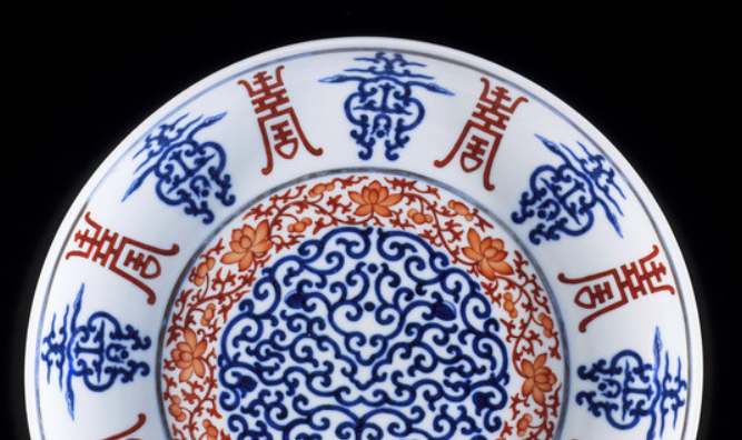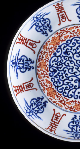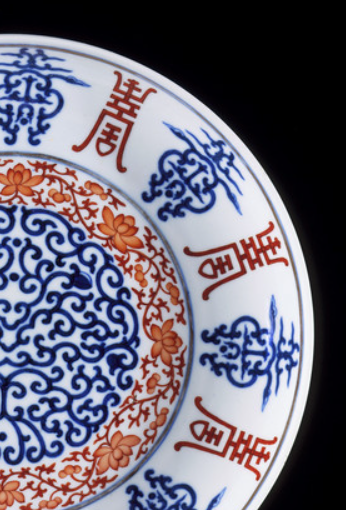 本品规格为4.45 × 26.35 厘米。以洁白细腻的瓷胎为底。盘心绘有繁复的青花缠枝纹,线条流畅,图案饱满,展现出细腻的笔触与精湛的工艺。围绕盘心的是一圈矾红彩绘制的花卉纹饰,花朵鲜艳夺目,给人以热烈之感。