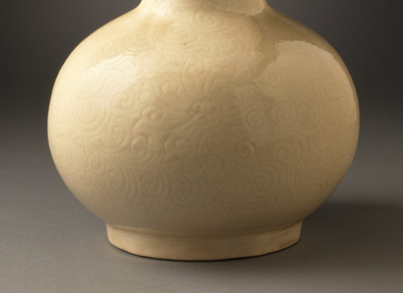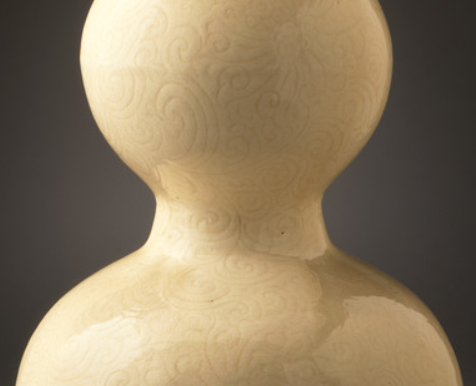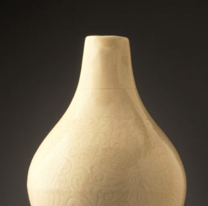 本品规格为33.02 x 19.69 厘米。造型为经典葫芦形,上下两肚圆润饱满,束腰过渡自然,小口微撇,线条流畅优美。通体施白釉,釉色温润柔和,呈淡雅米黄调,如凝脂般莹润。瓶身以刻花工艺饰有细密纹饰,似缠枝或卷草纹样,线条婉转,在素白釉面凸显立体感,兼具含蓄与精致。
