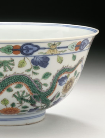 本品规格为7.94 x 15.88 厘米。造型为经典撇口碗,胎质细腻洁白。以斗彩工艺装饰,碗口沿饰青花线条及彩色如意云头纹、花卉纹;腹部主体绘一条绿龙,龙身矫健,辅以红、紫、黄、绿等色彩的花卉、火焰纹,色彩搭配和谐,青花与彩釉相互映衬。