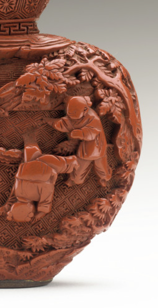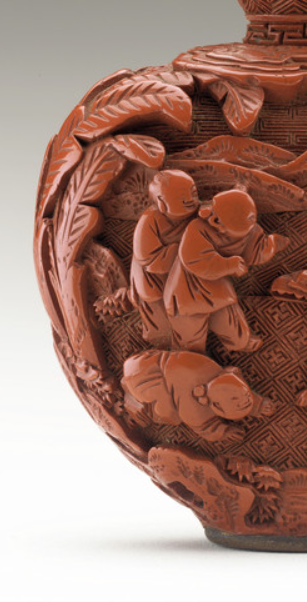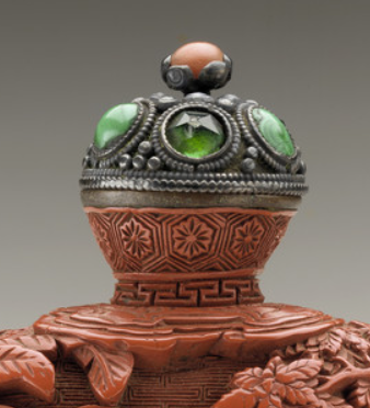 本品高度为9.7厘米,宽度5.4厘米。采用剔红工艺(雕漆的一种 ),以红色漆层雕刻。壶身呈现婴戏场景,孩童嬉戏姿态生动,雕刻细腻,层次丰富。壶盖镶嵌宝石,增添华贵感。