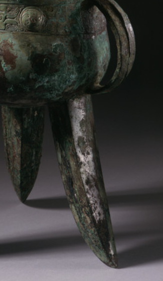 本品规格为20 x 19.69 x 18.73 厘米。造型独特,为三足、一鋬(环形把手)、双柱的盛酒 / 温酒礼器。器身有锈蚀,显岁月痕迹,腹部饰兽面纹等商代典型纹饰,庄重神秘。双柱顶有帽,柱身带纹,三足尖长外撇。