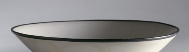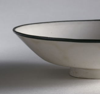 本品高度为4.45厘米,直径为16.83厘米。碗呈浅腹、撇口、圈足造型,施温润白釉,口沿镶金属扣(黑色边 ),即 “镶口” 工艺,为保护瓷口、提升档次,是定窑高档器特征。
