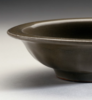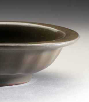本品规格为3.81 x 13.34 厘米。造型为菱花形口沿,浅腹微弧,圈足矮而规整。通体施青釉,釉色呈沉稳青灰色,釉层肥厚莹润,如冰似玉,口沿因釉水流动稍显轻薄,圈足露胎处呈红褐色(“铁足” 特征 )。