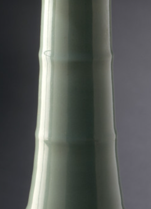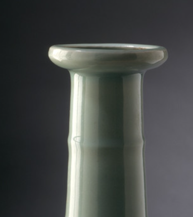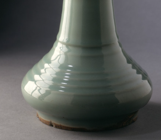 本品高度为29.21厘米,直径16.51厘米。呈盘口、长颈、鼓腹、圈足的经典造型。盘口内敛,便于插花或陈设时稳定;长颈修长挺拔,颈部装饰竹节状弦纹(凸起的环形线条 ),既打破单调,又暗合宋代文人 “慕竹之节” 的审美;鼓腹圆润饱满,下腹渐收,圈足露胎处呈暗褐色(“铁足” 特征 ),呼应龙泉窑工艺。