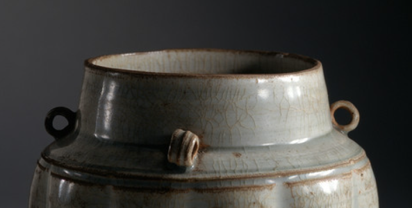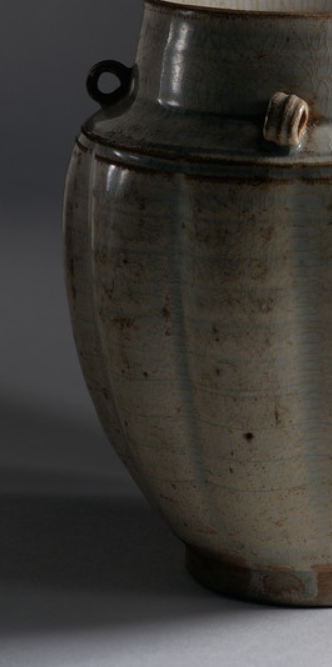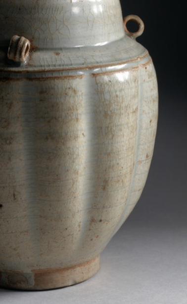 本品规格为13.34 x 10.48 厘米。罐体呈瓜棱形,腹部线条似瓜瓣,别致又具韵律。颈部设四系(两环形、两纽形 ),可穿绳提携,兼具实用与装饰性。施青白釉,釉色温润,因岁月与使用,釉面有开片、积尘与磨损痕迹,却更显古朴厚重。