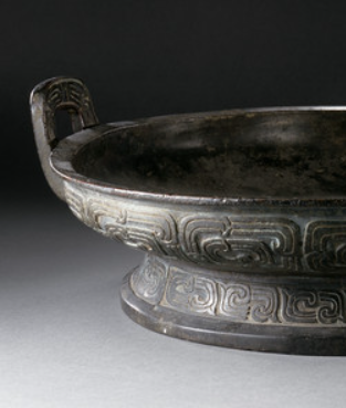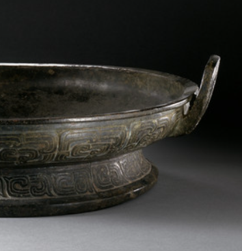 本品规格为9.53 x 47 x 44.45 厘米。整体呈圆形,有双附耳,圈足低矮。盘身以黑绿锈蚀的青铜为质,外壁饰有典型西周风格的窃曲纹(或类似的带状几何纹饰 ),线条婉转,古朴庄重。附耳造型简约,与盘身衔接自然,圈足纹饰与腹部呼应,工艺精湛。