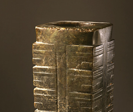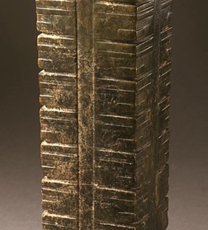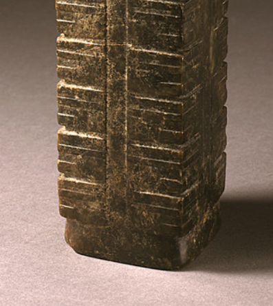 本品规格为29.21 x 7.94 x 7.94 厘米。呈内圆外方的柱体,中间有贯穿上下的圆孔,体现 “天圆地方” 的宇宙观,外方的四面常雕刻有简化或复杂的纹饰,表面打磨规整,线条硬朗。