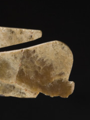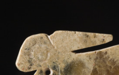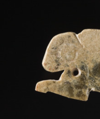 整体雕刻为卧兔形态,双耳竖起,身体蜷曲,尾部与后肢简化,背部有一穿孔(用于系绳佩戴),以阴刻线勾勒眼部、腿部轮廓,风格抽象古朴,抓住兔子 “竖耳、蜷卧” 的典型特征,体现早期玉雕 “重形态概括、轻细节写实” 的特点。