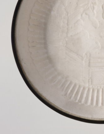 本品高度为2.2厘米,直径为14厘米。整体呈圆形。口沿镶黑色金属扣,即 “镶口” 工艺,用于保护瓷口并增添精致感。盘施温润白釉,盘心以印花工艺呈现图案,含建筑、植物(如竹子 )等元素,构图规整,线条细腻。盘内壁有放射状凸纹装饰,丰富视觉层次。