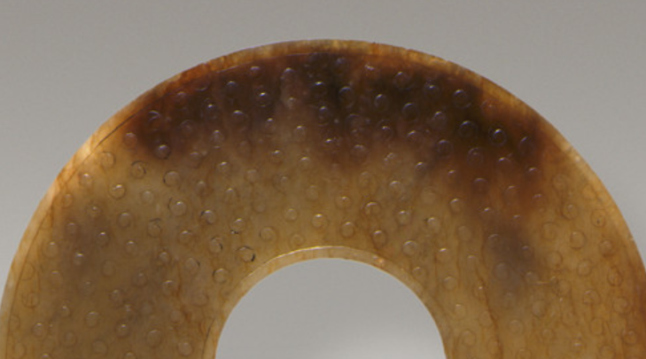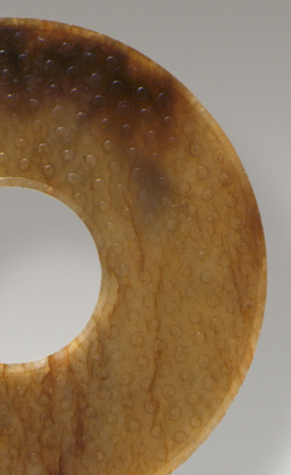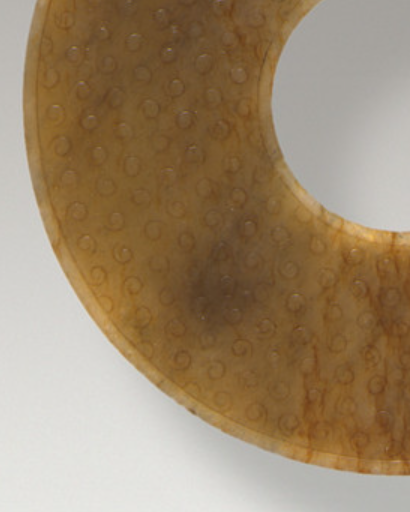 本品直径为11.4厘米。整体为圆形扁平体,中心有孔,体现 “天圆” 的象征,是玉璧最典型的形态。表面满饰谷纹(又称 “涡纹”),即以凸起的圆形颗粒(似谷粒)为基本单元,排列规整,颗粒饱满,部分谷纹周围有阴线勾勒轮廓,模仿谷粒的形态,寓意 “五谷丰登”。