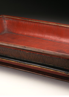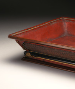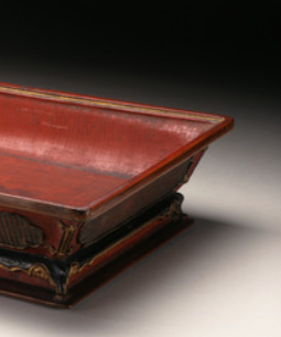本品规格为7.31 x 41.91 x 25.4 厘米。造型为规整长方形,主体髹饰鲜艳朱漆,外壁可见细密竹编纹理,工艺精巧。盘体边框及底座有黑色、金色装饰,线条流畅,增添华丽感。它融合朱漆的典雅与竹编的质朴,兼具实用(盛放物品 )与审美价值,体现清代漆器与竹编工艺结合的特色。