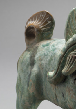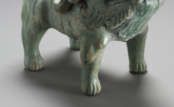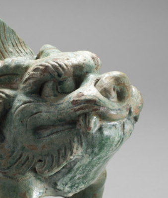 本品规格为19.05 x 25.4 x 13.97 厘米。以陶为胎,施绿釉(含铅、铜,低温烧制 ),釉色因岁月呈现绿中泛青、局部剥落的古朴质感。造型为神兽,融合狮、辟邪等瑞兽特征,圆目怒睁、阔口露齿,头生羽翼、尾作卷翘状,体态敦实却具动感。模制与雕塑结合,粗粝线条勾勒神韵,夸张造型凸显威严,体现汉代陶塑 “重神韵、简细节” 的工艺风格 。