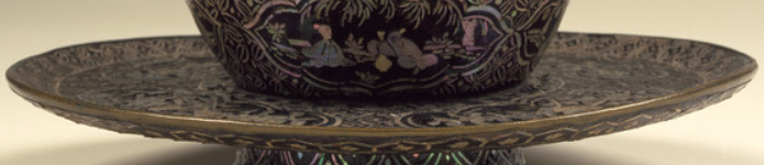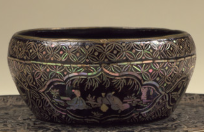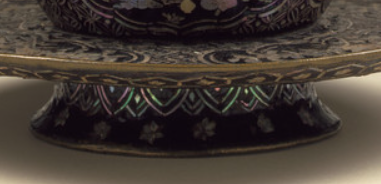 本品规格为7.14 x 16.67 厘米。以木(或夹纻 )为胎,髹饰多层黑漆作地。采用螺钿镶嵌工艺,将贝壳切割成薄片,精细打磨成人物、花草、几何纹等形状,嵌入漆层。经髹漆、研磨、推光,螺钿随光线折射出五彩光泽,借深浅、色彩差异,呈现浮雕般立体效果。盏托分体设计,盏敛口鼓腹,托为高足盘形,实用与审美兼具 。