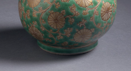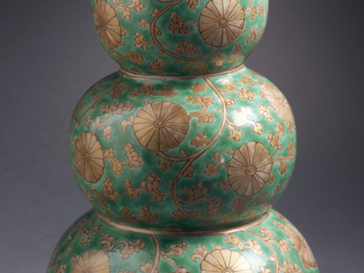 本品规格为28.10 x 13.34 厘米。呈多节葫芦形,由上至下逐节收缩又鼓胀,共分四节,小口、细颈、敛口、鼓腹,线条流畅,仿生葫芦形态,寓意福禄,契合传统吉祥文化 。以绿色为地,施金彩描绘缠枝莲纹,缠枝婉转,莲花饱满,金彩与绿地对比鲜明,华丽且富有层次感。金彩工艺需施釉后绘金、低温烘烤,对技法要求高。