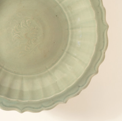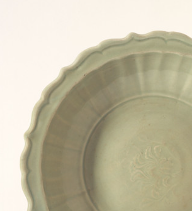 本品高度为6.99厘米,直径33.97厘米。盘口为菱花形,边缘呈波浪状起伏,形似莲花瓣,富有韵律感。盘壁有明显的棱线装饰,增添层次感。以龙泉窑典型的瓷土为胎,施青釉,经高温烧制而成。采用印花工艺,盘心模印花卉纹饰,线条细腻,图案清晰,结合菱口造型,展现出明代龙泉窑在制瓷工艺上的传承与创新,青釉温润,呈淡雅的青绿色,釉面光泽柔和 。
