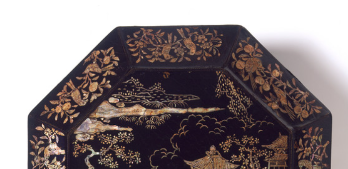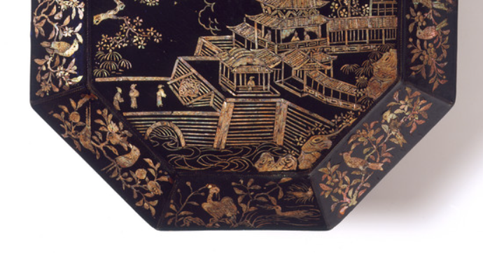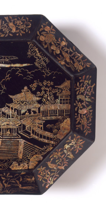 明代螺钿漆器楼阁山水纹八边形盘