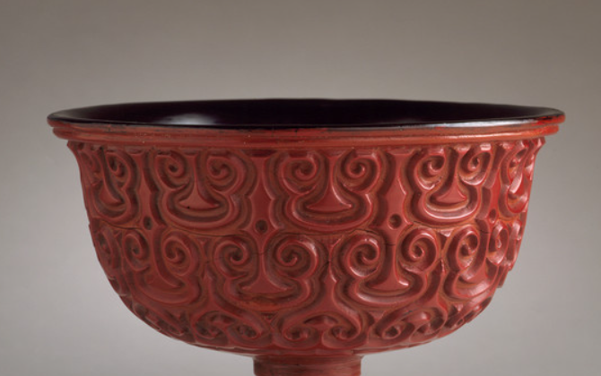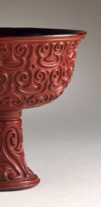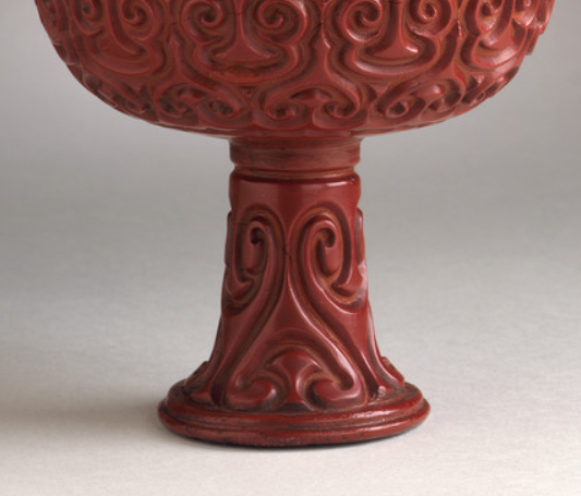 本品规格为9.21 x 14.29 厘米。 杯身呈碗状,线条圆润;高足修长,比例协调,既保留 “实用功能”(持握、防洒 ),又融入 “文人审美”(端庄、简洁 )。杯身与高足满雕 “卷草纹”,属明代剔红典型纹饰。卷草纹连绵缠绕,呈 “S” 形婉转,象征 “生生不息、吉祥延绵”。雕刻时,利用漆层厚度,塑造 “浮雕效果”—— 草叶有 “起、伏、转、折”,与平面漆层形成 “立体层次”,让静态纹饰具 “流动感”,体现明代 “以纹表意、以雕塑形” 的装饰智慧 。