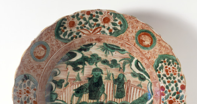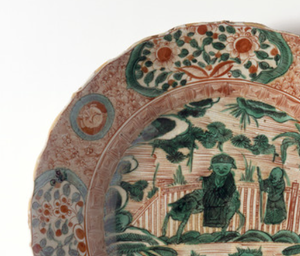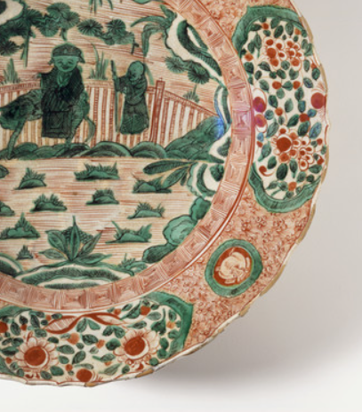 本品直径为40.3 厘米。花口设计,盘沿如花瓣舒展,线条灵动,契合明代仿生造型审美,添器物别致韵味,实用(便于持握)与美观兼具。盘心人物故事传递文人雅趣、社会生活百态;盘沿花卉团纹寓意吉祥富足,是 “图必有意” 传统体现,借图案载文化、寄情思,展现明代工艺文化表意智慧。