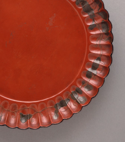本品高度为3.02厘米,直径27.62厘米。以木胎(或夹纻胎 )为底,髹饰多层朱漆,色泽纯正鲜艳,历久弥新。盘沿作菊瓣形,曲折灵动,如菊花绽放;凹槽处描金绘枝叶,金彩纤细流畅,与朱漆形成鲜明对比,“描金” 工艺精细,需趁朱漆干透,以细笔勾勒,尽显匠人的耐心与技艺,是明代漆艺 “华丽而不失精致” 的体现 。