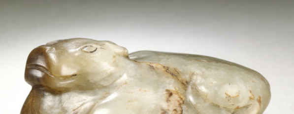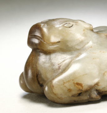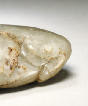 本品规格为2.54 x 3.49 x 6.67 厘米。以圆雕呈现卧牛姿态,牛身线条圆润简洁,四肢蜷曲贴地,符合南北朝玉器 “重神韵、尚简约” 风格。阴线刻勾勒牛眼、口鼻,虽雕刻不繁缛,但憨态可掬、生动传神,体现 “以简驭繁,形神兼备” 的工艺,玉质受沁,呈现灰白、褐黄斑驳色泽,添古朴质感 。