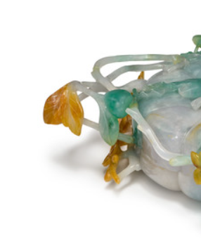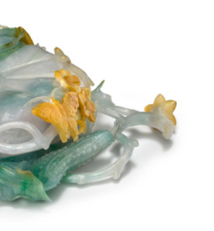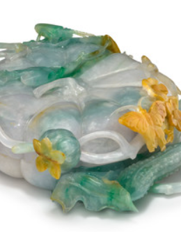 本品高度为16.51 厘米。选翡翠为料,有绿、白、黄等色,温润细腻。用圆雕、镂雕,雕成南瓜,还刻藤蔓、叶、花,线条流畅,造型逼真,展现清代玉雕师高超技艺,如 “黄皮巧雕叶片、花朵” (利用翡翠天然皮色 ),是 “因材施艺,化瑕为瑜” (翡翠有杂色,借雕刻变装饰 )的典范 。