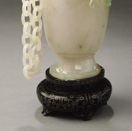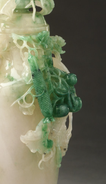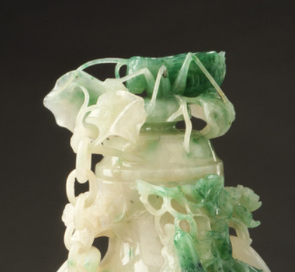本品规格为25.72 x 10.16 厘米。取缅甸白绿双色翡翠,白肉琢瓶身、活链,绿翠雕花果、蚂蚱。活链以 “掏链法” 从整块翡翠掏出,环环相扣、纤细通灵,难度极高,尽显 “因色赋形、因材施艺” 巧思,是清代 “一翠多用,巧链通灵” 工艺的极致 。