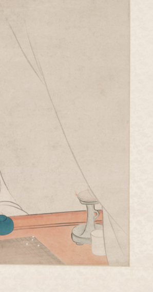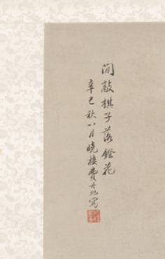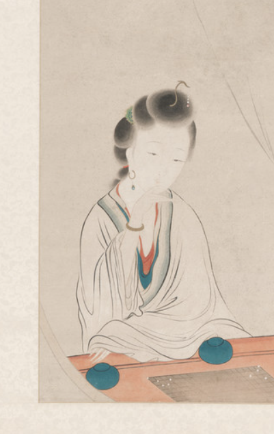 本品规格为102.87 x 41.91 厘米,安装172.72 x 58.42 厘米,滚轮66.36厘米。采用典型的 “留白” 构图,画面上方大面积空白,营造出空灵、静谧的氛围,下方聚焦仕女与棋具,形成 “上虚下实” 对比,以空白传递 “闲” 意,契合 “闲敲棋子” 的诗意情境,体现传统绘画 “计白当黑” 智慧。仕女居于画面下方,发髻高挽,插饰简约,身着宽松素衣,衣纹以细笔勾勒,线条秀润轻柔、流畅婉转。她神态悠然,手持棋子轻敲,眉眼微垂,面容温婉秀丽,尽显含蓄文雅之美,是费丹旭 “费派” 仕女画 “柔弱纤细、温婉静美” 风格的典型呈现。