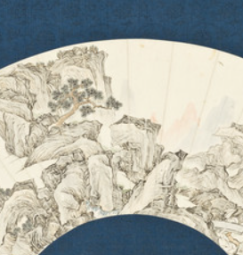 本品规格为27.94*59.06厘米,安装122.56*67.63厘米,滚轮73.34厘米。以水墨为骨,淡赭石、花青渲染,用披麻皴勾山石纹理,胡椒点苔,呈现 “墨分五色,色助墨韵” 。扇面构图 “高远 + 深远” ,左下部山石堆叠,中间留白为云雾,右上部远山隐现,开合有度、虚实相生,人物点睛,体现 “天人合一” ,符合 “咫尺千里” 扇面特点 。