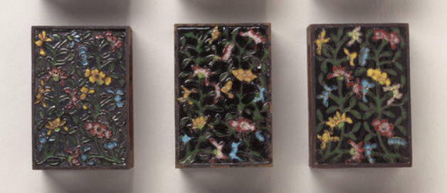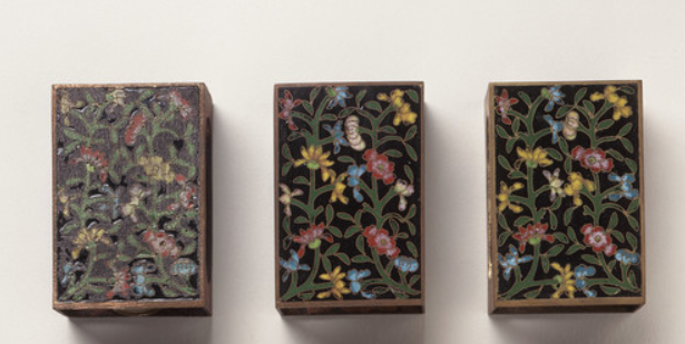 本品规格为储物盒23.5 x 17.15 x 4.13 厘米,小盒6.03 x 4.13 x 2.54 厘米。这组清代铜胎画珐琅花卉纹小盒,共 9 件,分三排陈列。上两排 6 件为铜胎画珐琅工艺,以黑色为地,盒面绘彩色花卉图案,花朵形态各异,色彩有黄、红、蓝等,搭配翠绿枝叶,珐琅釉料经烧制后色泽明艳且富有光泽,细腻呈现花卉生动姿态;下排 3 件为素胎,表面有锈蚀、錾刻花纹等,虽无珐琅彩饰,却展现古朴质感,与上两排形成工艺对比 。