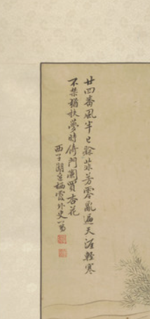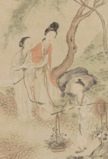 在清代,文人阶层注重生活情趣与艺术修养, 仕女图轴作为一种绘画艺术形式,是他们书房、客厅中的常见陈设。 画面中仕女的优雅姿态、细腻的绘画技法、优美的山水背景以及蕴含诗意的题跋 ,都能为文人带来视觉和精神上的享受。 他们可以在闲暇时光细细品味画作的笔墨韵味、色彩搭配, 感受画家通过画面传达出的情感和意境,从而获得审美愉悦和心灵慰藉。