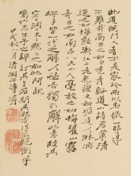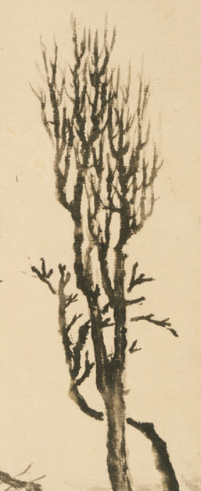 石涛生活在明清易代之际,明朝的覆灭与清朝的建立,使社会经历了巨大的动荡与变革。作为明朝宗室后裔,石涛幼年便遭遇家国之变, 身世的坎坷与政治身份的敏感,让他在新政权下内心充满复杂情感。这种社会背景促使他在艺术创作中寻求精神寄托, 作品中的枯木形象或许正是他对自身境遇的一种隐喻,题跋文字则是他抒发内心感慨、排解情绪的方式。