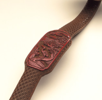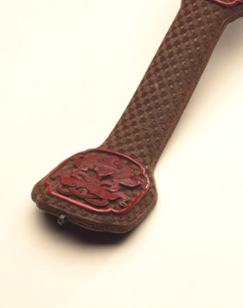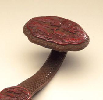 本品规格为40.6 x 7 x 10.4 厘米。以木(或竹)为胎,如意首、中、尾三处镶饰剔红雕件,经多层髹漆、精细雕刻而成。剔红部分朱漆层肥厚,雕刻出山水、瑞兽等图案,线条硬朗,浮雕立体,尽显 “藏锋清楚,棱线有力” 的清代剔红工艺特色;如意杆采用编织纹理,质朴与剔红的华丽形成对比,是多种工艺融合的典范,体现清代对繁缛复合美的追求。
