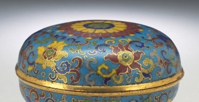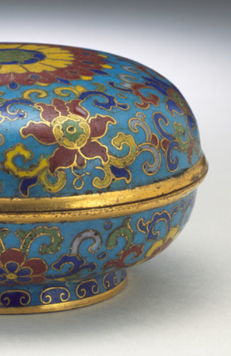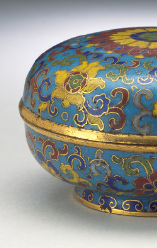 本品高度为4.1厘米,直径为9.5厘米。以铜为胎体,运用掐丝珐琅工艺,先以细铜丝在胎上掐出图案轮廓,再填烧珐琅彩釉,经多道工序制成。为圆形盖盒,上下子母口扣合,盖面隆起,圈足规整,整体线条圆润流畅,兼具实用与装饰性。主体饰番莲(西番莲)纹,辅以缠枝、卷草等辅助纹样,盖顶中心图案尤为突出,色彩丰富,通过蓝、黄、红、绿等珐琅釉色搭配,呈现华丽视觉效果,铜丝掐出的轮廓与金色边缘(可能经镀金处理 ),增添精致感与贵气。