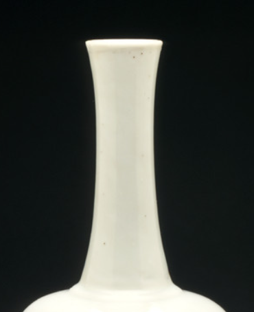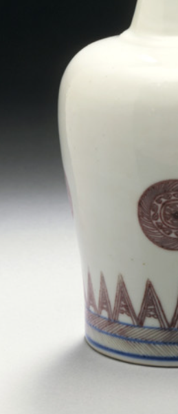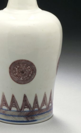 本品规格为24.13*9.53厘米。因形似摇铃得名,小口、细长颈、丰肩、敛腹,线条流畅优美,端庄典雅,符合清代宫廷及文房对瓷器造型的审美需求。运用釉里红工艺,以铜红料在胎体绘画,施透明釉后经高温还原焰烧成。釉里红是元代创烧的釉下彩品种,红色图案藏于釉下,色彩稳定且具独特韵味。