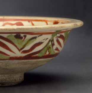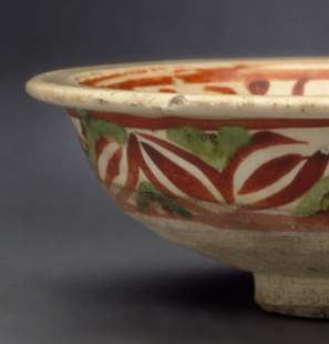 本品直径为12.7厘米。为敞口、浅腹、圈足碗,造型简洁实用,符合元代民间餐具需求。敞口便于盛食,浅腹利于散热,圈足矮小稳固,体现 “实用优先” 的民间器物设计逻辑,虽无复杂器型变化,却具敦厚质朴之美 。以白为地,红、绿彩绘制花叶纹。红色线条硬朗,绿色点缀鲜活,花叶纹形态自由,或舒展、或卷曲,布局满而不乱,形成强烈视觉对比。色彩虽历经岁月有磨损,但仍保留浓郁的民间艺术气息,展现元代百姓对 “色彩鲜艳、图案生动” 的审美偏好 。
