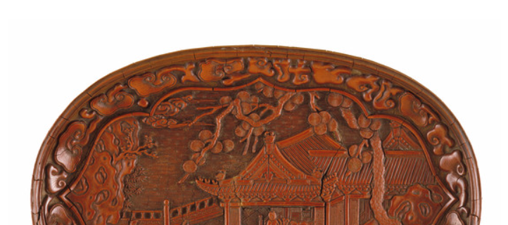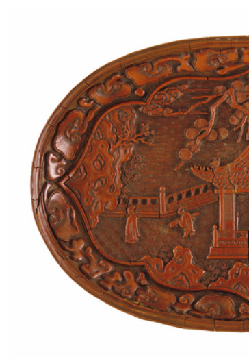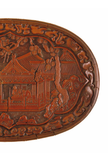 本品规格为3.18 x 23.4 x 16.1 厘米。呈椭圆形,边缘雕如意云纹(寓意吉祥 ),盘心以如意云纹开光,雕刻楼阁人物主题,以木(或灰 )为胎,髹饰多层朱漆,采用剔红工艺,经分层雕刻,在厚漆层中深剔、浅剔结合。锦地纹打底,楼阁人物高浮雕突出,楼阁飞檐、斗拱、门窗,人物衣纹、动态,树木枝叶、纹理,层次分明,体现元代雕漆 “浑厚圆润、藏锋清楚” 特征,朱漆色泽沉稳,经岁月沉淀更显古朴 。