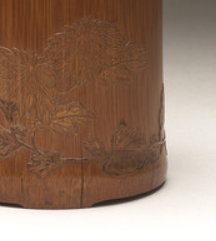 本品规格为8.89 x 9.21 厘米。以天然竹材为料,竹壁厚实、竹节规整。采用浅浮雕(或留青竹刻)工艺,剔除部分竹青,保留花卉轮廓,雕刻出兰花、菊花等图案。线条纤细流畅,花瓣、枝叶层次分明,如兰花舒展、菊花盛放。呈素面筒形,高度与直径比例协调,契合文房插笔、取笔需求。