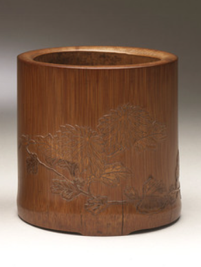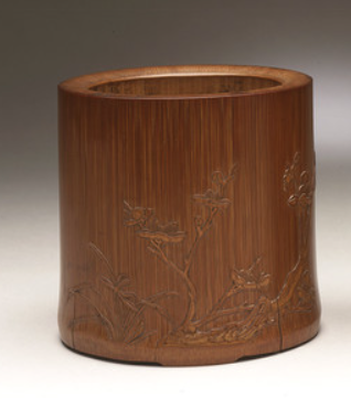 在清代,毛笔是文人进行书写、绘画创作的主要工具。 竹刻花卉纹笔筒凭借其筒状造型,能够方便地将毛笔插放其中, 便于文人随时取用,同时也起到了对毛笔的整理和收纳作用,让文房桌面更加整洁有序 。
