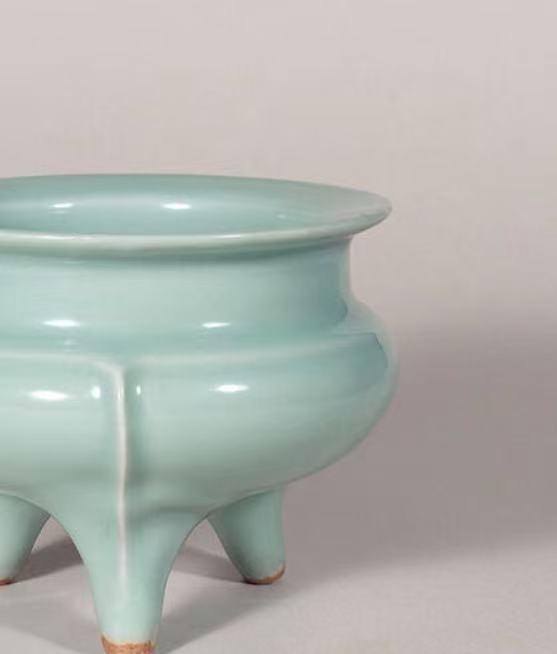 龙泉窑青磁袴腰香炉诞生于南宋时期,由龙泉窑工匠集体制作。当时南宋偏安江南,文人雅士推崇 “焚香、点茶” 等雅事,对雅致香炉需求旺盛,且金石学兴起带动仿古风潮。工匠们为顺应社会审美与实用需求,融合青铜鬲造型与青瓷工艺创作出此器,既借仿古造型呼应对古礼的追慕,又以温润青釉与精巧 “出筋” 工艺,表达对自然之美的崇尚及宋代文人内敛雅致的审美追求。