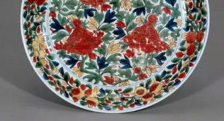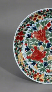 出光美术馆所藏明代万历时期色绘牡丹纹皿,为景德镇民窑工匠群体协作而成。其以 “瓷石 + 高岭土” 二元配方为胎,白釉为地,采用釉下青花勾勒、釉上五彩填绘工艺。直径38.6厘米,器皿中央绘太湖石与盛放牡丹,外围分八个扇形区域绘缠枝莲、宝相花等,口沿环回纹,外壁饰青花卷草纹,色彩浓艳,构图繁而不乱,尽显万历五彩 “浓翠红艳” 特点。牡丹象征富贵,太湖石寓意长寿,缠枝莲表连绵,宝相花含吉祥,整体寄托 “富贵长寿、吉祥永昌” 的愿景,既反映宫廷对繁丽审美的追求,也体现民间对幸福的向往。