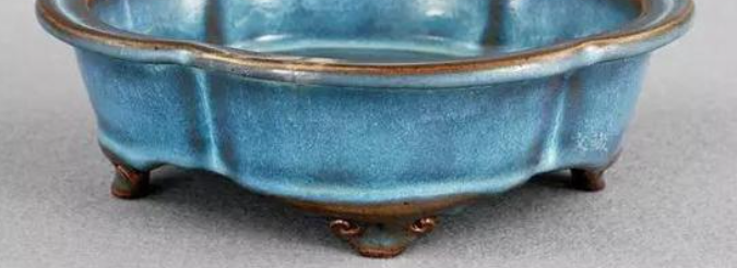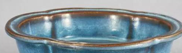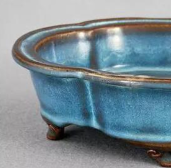 钧窑紫红釉盘,为工匠集体创作。瓷质胎体坚实,以含氧化铜、铁的釉料经高温窑变形成紫红釉。盘长 19.8 厘米、宽 16.5 厘米,造型古朴规整,口沿因窑变稍显不规则。盘内紫红釉绚丽,蓝紫交融,釉面肥厚有乳浊感,带窑变流淌纹理;外壁釉色渐淡,圈足修胎规整,底部刻 “三” 字,推测为成套器物之一。其窑变体现 “天人合一” 思想,紫红釉中红色象征吉祥繁荣,紫色寓意高贵祥瑞,寄托了对美好生活的向往。