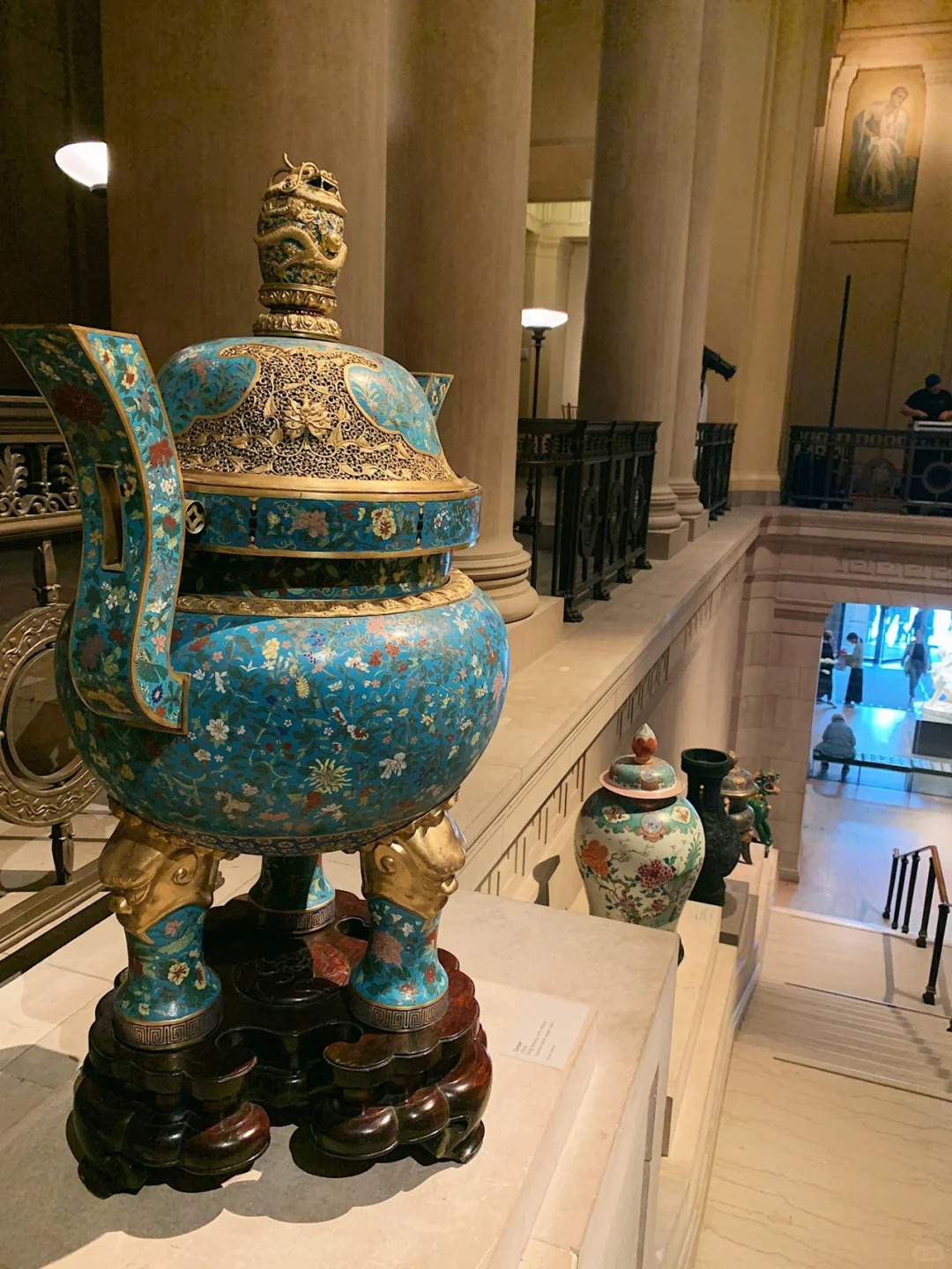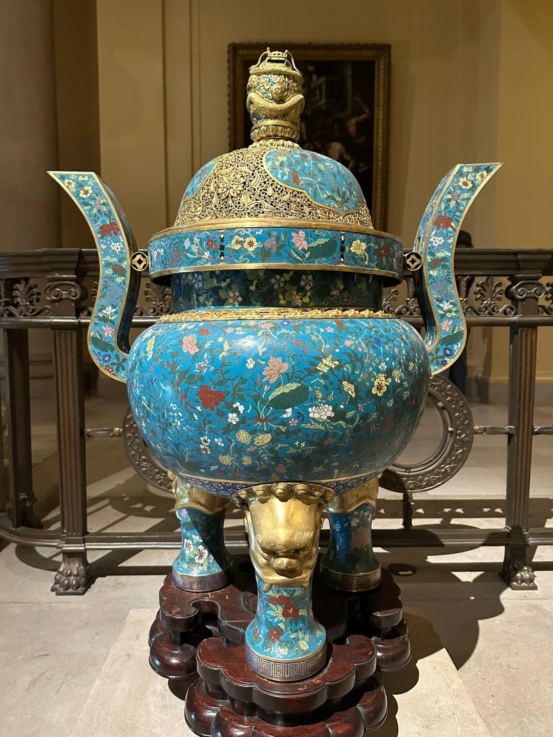 景泰蓝工艺在清代达到了新的高度,工匠们不断改进技术,丰富色彩,使得景泰蓝制品的质量和艺术水平都有了很大提高。清代宫廷对景泰蓝工艺非常重视,大量制作景泰蓝器物,不仅用于宫廷陈设和祭祀,也作为赏赐品赐予大臣和外国使节,波士顿美术馆的清代景泰蓝香炉可能就是在这样的背景下流传到国外的。