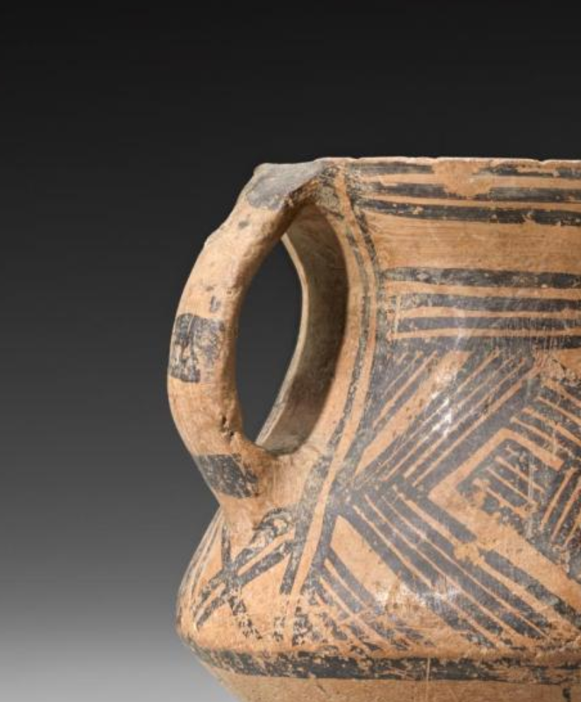 新石器时代陶器高约 38 厘米,口径 12 厘米,腹径 28 厘米。采用分段泥条盘筑法制成,器表经慢轮修整,质地细腻。颈部以黑彩绘出漩涡纹与锯齿纹,线条流畅且富有动感,腹部则密布菱形网格纹,纹饰规整而精美,体现了当时高超的绘画技艺。肩部对称分布四个乳钉状装饰,增加了器物的立体感和美观度。陶罐表面局部经过打磨抛光,呈现出光亮的质感,黑红双色彩绘历经千年仍鲜艳夺目。采用分段泥条盘筑法,器表经慢轮修整,彩绘使用矿物质颜料,历经千年仍鲜艳