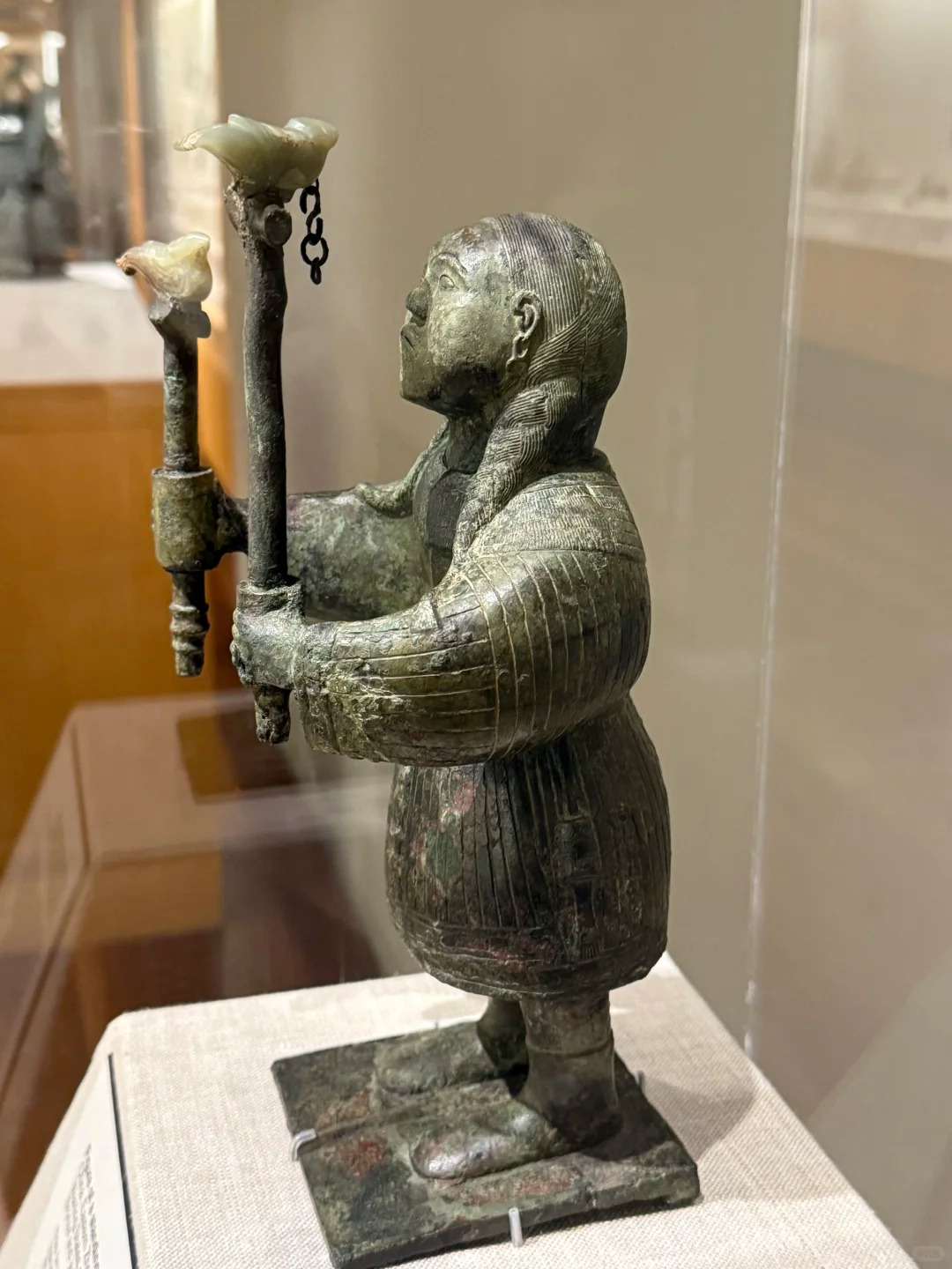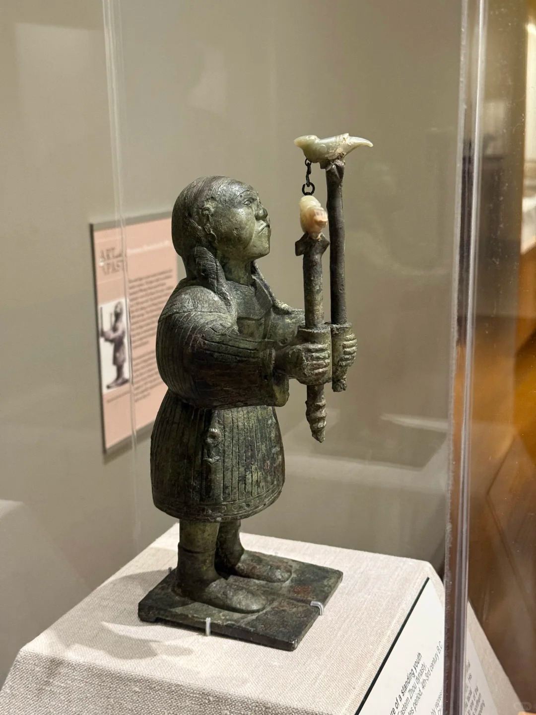 东周(公元前 770 年 — 前 256 年)是中国青铜时代向铁器时代过渡的关键期,礼崩乐坏促使青铜器从祭祀重器转向生活化与艺术化表达:该立像的异域造型反映战国时期中原与北方游牧民族的频繁互动。洛阳金村作为东周都城,是「丝绸之路」早期贸易的重要节点,西域驯鸟技术可能通过此路径传入中原。战国雕塑从商周时期的抽象神秘转向写实叙事,该立像以动态捕捉与细节刻画(如贝饰、皮靴)开创了人物雕塑的先河,直接影响秦代兵马俑的写实风格。传统礼器(如鼎、簋)数量减少,实用器(如灯、带钩)与装饰性雕塑增多,体现贵族生活从「敬天法祖」向「人本位」的转变。