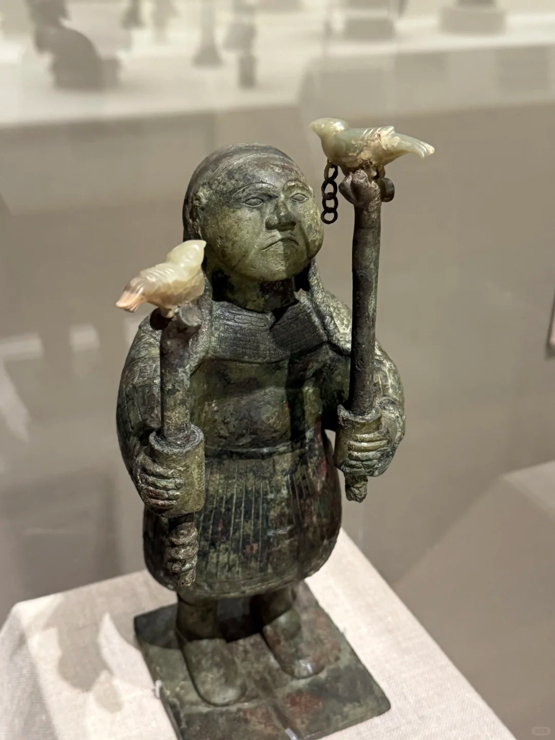 双手持筒形物(内径约 3 厘米),筒内插短棍,棍端各立一玉鸟(现存波士顿美术馆库房)。人物头部微仰,目光聚焦于双鸟,生动再现驯鸟场景。