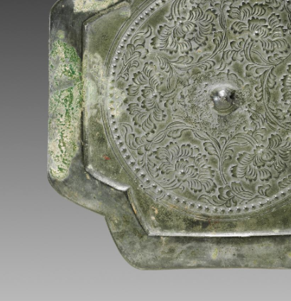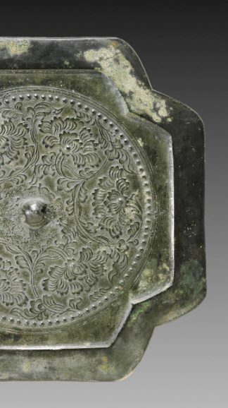 本品规格为0.7 x 16.5 厘米。整体呈菱花形,轮廓线条硬朗且富有变化。镜体中心设圆形镜钮,便于手持或悬挂。主体纹饰区域为圆形,满布细腻的花卉图案,花叶卷曲舒展,线条流畅婉转,似在镜面上蔓延生长,周边以连珠纹装饰,与中心纹饰呼应。铜镜表面因岁月侵蚀,呈现出古朴的青绿色锈迹,部分区域锈色斑驳,尽显历史沧桑感,却也让其独特的造型与精美的纹饰更显厚重,生动展现北宋铜镜工艺的精湛与审美意趣 。