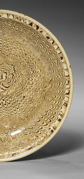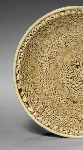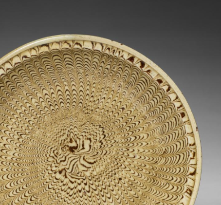 本品直径为北宋绞胎瓷羽毛纹盘。为浅腹盘(敞口、 浅弧腹、 矮圈足 ), 器型规整简约(口沿圆润, 腹部线条流畅 ), 符合宋代 “大道至简” 的审美 —— 无复杂装饰, 以 “绞胎纹理” 为核心, 让工艺本身成为 “最美的装饰”。