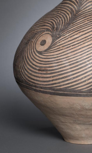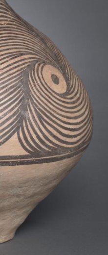 本品直径为39.1厘米,整体长度45.2厘米。造型为小口、短颈、鼓腹、小平底, 以橙黄陶为地,施黑彩绘制螺旋纹,线条流畅且富有韵律,如漩涡般动感十足, 图案对称分布,展现出独特的艺术风格。