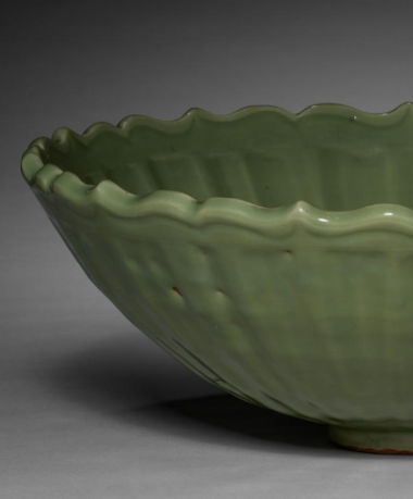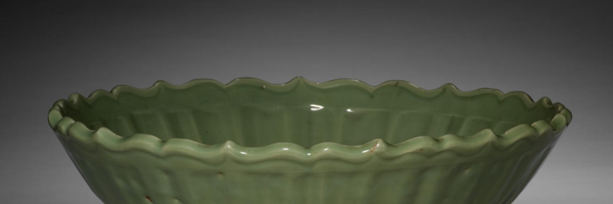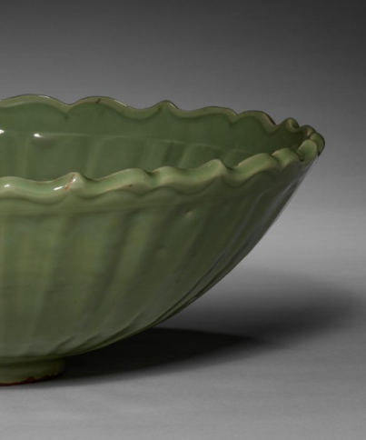本品规格为15.1 x 42 厘米。为花口菊瓣碗(口沿呈花瓣状, 腹部刻菊瓣纹, 深腹、 小圈足 ), 造型仿生而雅(花口模仿莲花、 菊花等自然花卉, 菊瓣纹如花朵绽放 ), 符合明代 “器以象生, 意趣盎然” 的审美 —— 花口增加视觉层次(便于握持, 又添装饰性 ), 菊瓣纹让碗身 “立体生动”(从口沿到腹部, 线条连贯如花瓣舒展 )。