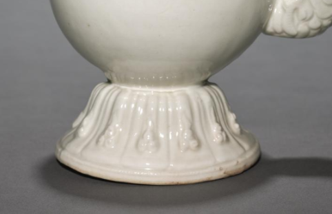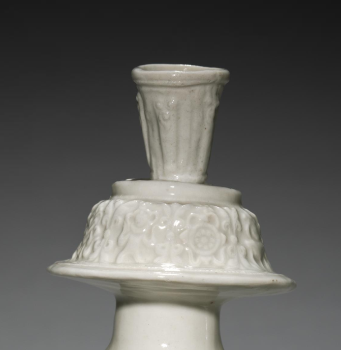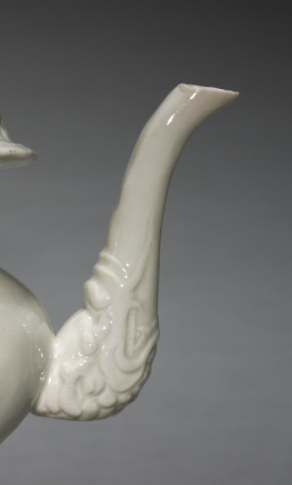 本品规格为17.5 厘米。造型规整,由瓶身、塔式盖、龙形流与莲瓣底座构成。甜白釉色纯净莹润,如冰似玉。盖面、底座有精美纹饰,龙形流雕刻细致,既具宗教功能,又展现明代制瓷高超技艺,是宗教文化与陶瓷艺术融合的典型器物 ,对研究明代宗教用瓷和陶瓷美学意义重大。